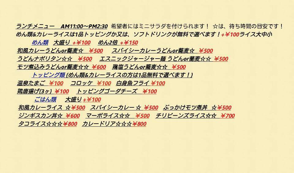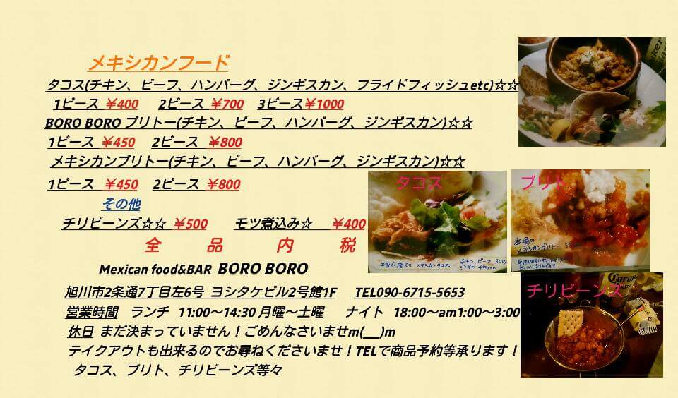 At Boro Boro in Asahikawa, the menu is a vibrant fusion of Mexican and Japanese flavors that keeps diners coming back for variety and bold tastes. The タコス stand out with their perfectly seasoned fillings, while the Soup offers a comforting start that balances the heartier dishes. Hearty staples like チリ ビーンズ, ブリトー, and チキンエンチラーダ showcase rich, layered flavors, complemented by the crisp freshness of メキシカンサラダ. For a unique twist, the Japanese-inspired モツ煮蕎麦 and もつ 煮 bring deep, savory warmth to the table, harmonizing beautifully with lighter options like ケサディーヤ and チーズ と コーン トルティーヤ. Lunch offerings are thoughtfully rounded out with ランチ のサラダ, ライス, and スープ, ensuring a balanced meal. The 牡蠣の唐揚げ provides a crunchy, flavorful bite that highlights the kitchen’s attention to detail, while the チキンラーメン offers a comforting, satisfying finish. Overall, Boro Boro’s menu succeeds in blending bold Mexican classics with Japanese nuances, giving every dish a distinct identity while maintaining a cohesive and inviting dining experience.